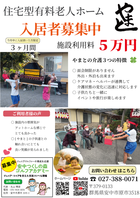 ホーム お知らせ 【入居希望者募集中】 敷金 :0円 利用料:5万/月(減額キャンペーン中!)[家賃・食費・管理費・光熱費・家具レンタル費用・オムツ代等含む詳細は、お問合わせフォーム またはお電話にてご確認ください。] 電話:027-388-0071 イベントの様子はこちら Facebook
